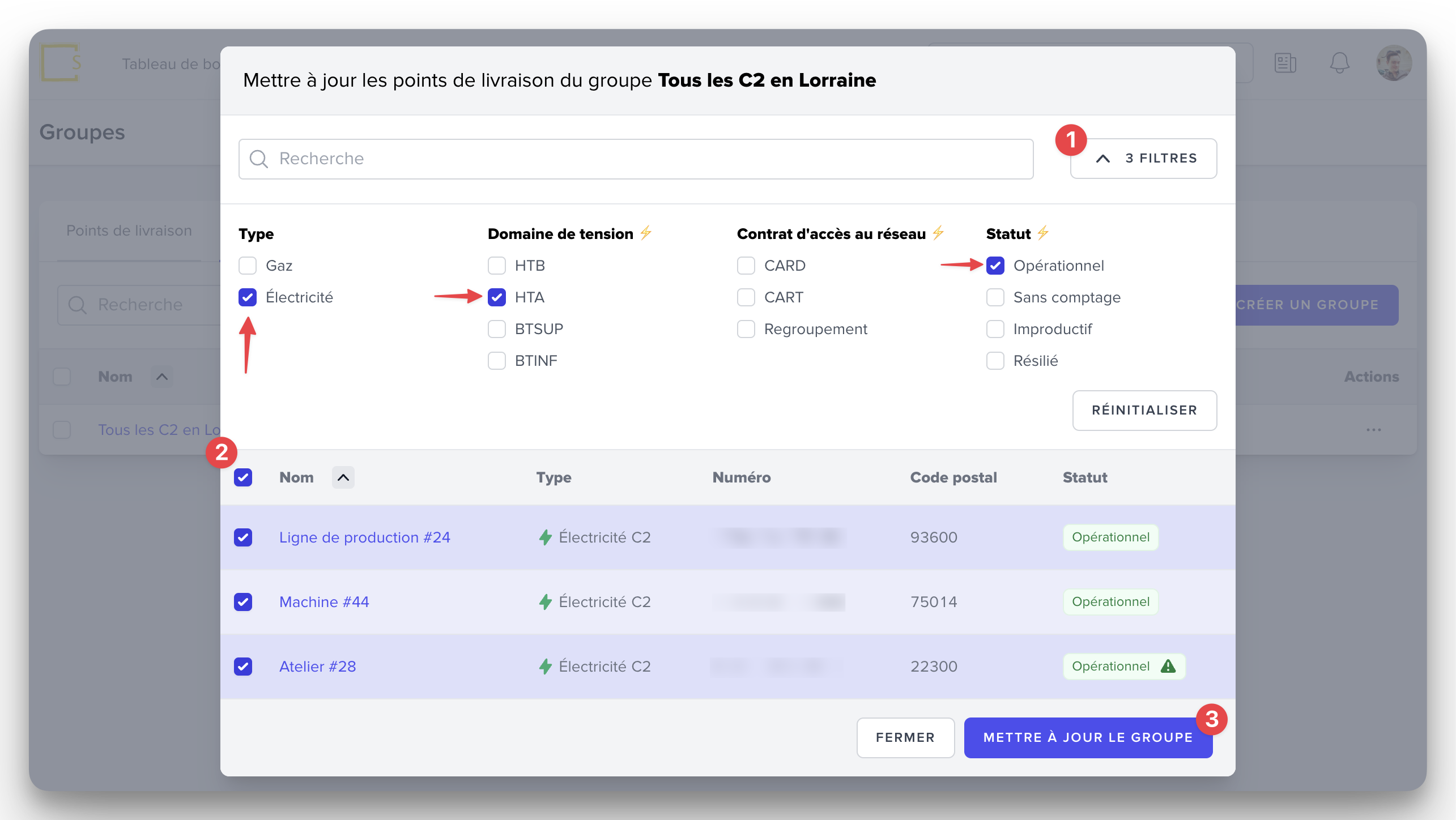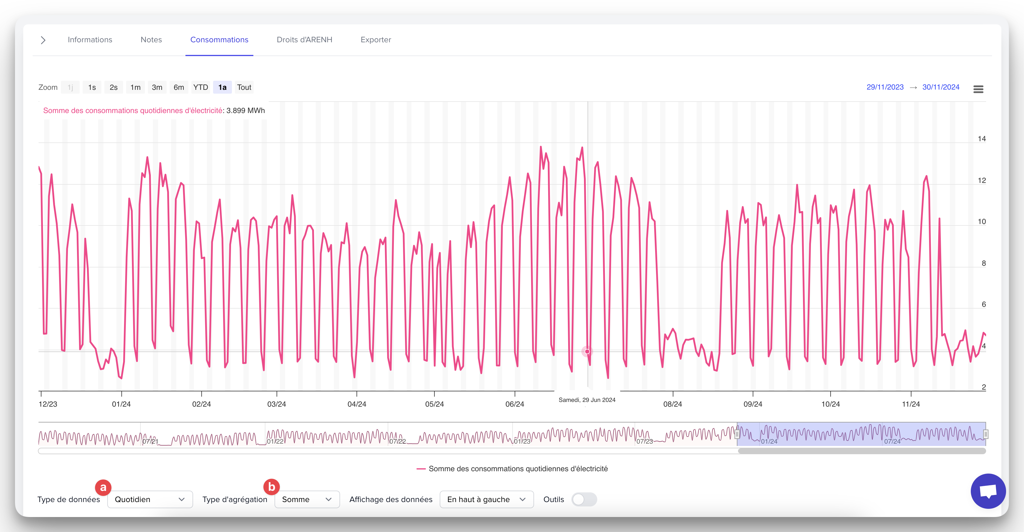 This feature allows you to easily visualize the data of a group of delivery points: consumption data (average, total), consumption peaks by hour and by day. This information helps you to efficiently manage your company's energy budget.