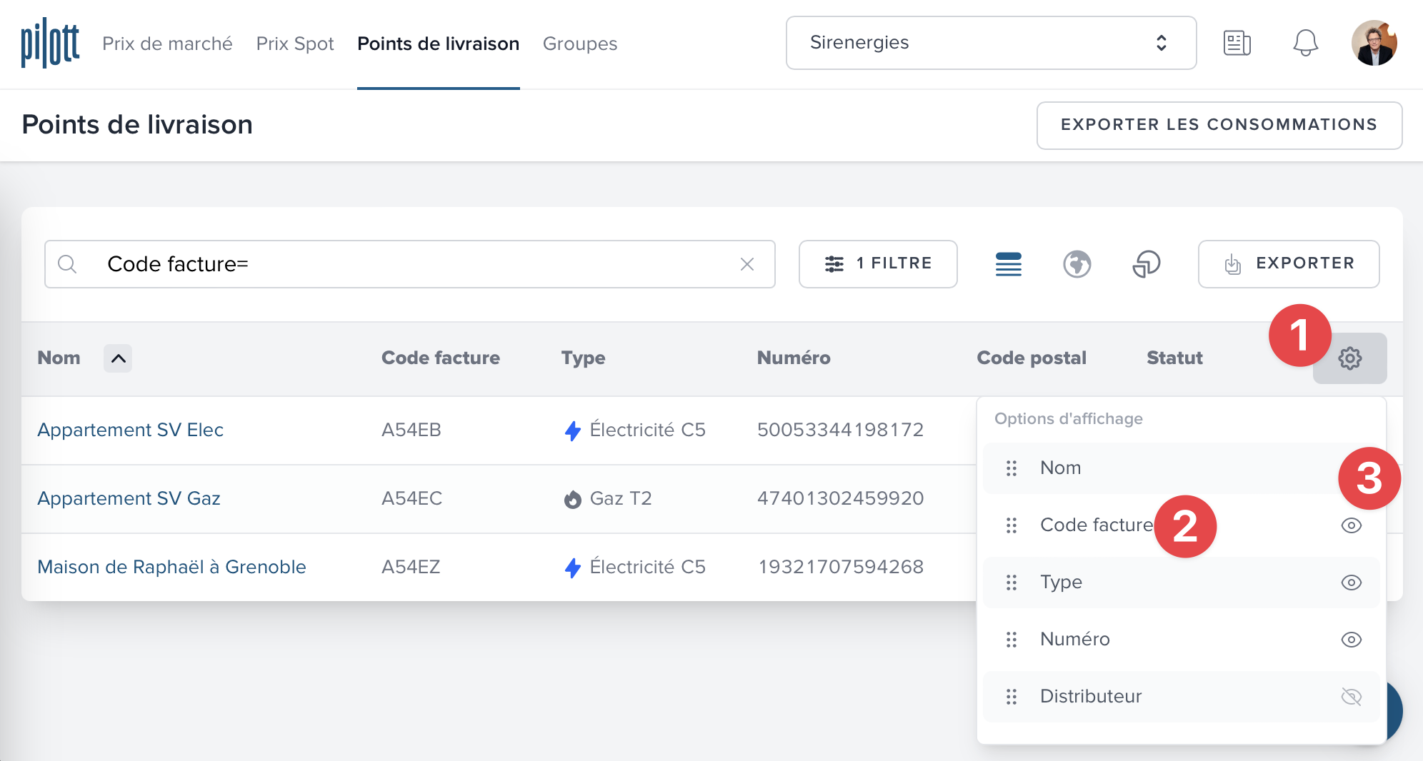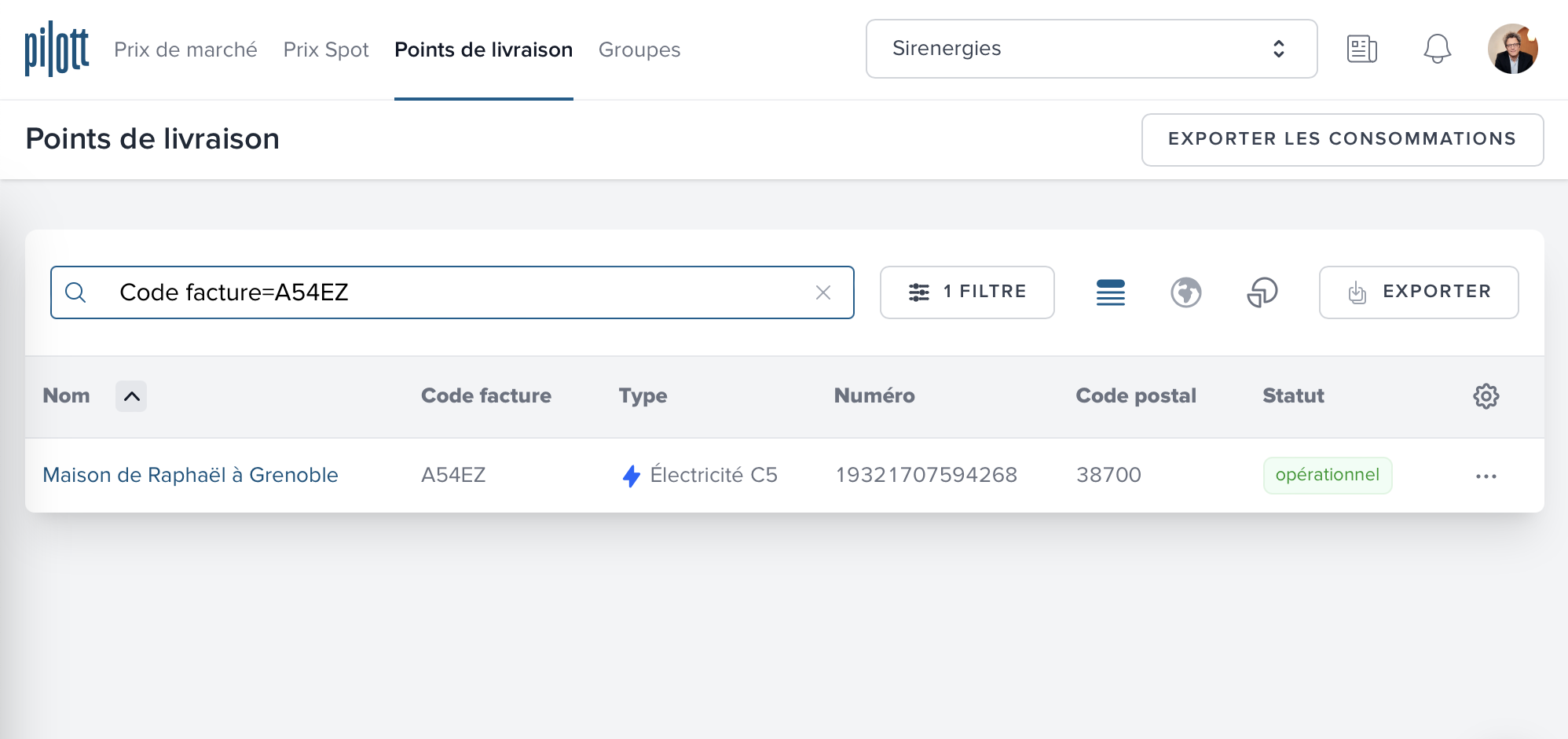 Code facture=A54 affichera tous les points de livraison qui ont la donnée métier Code facture commençant par la valeur A54