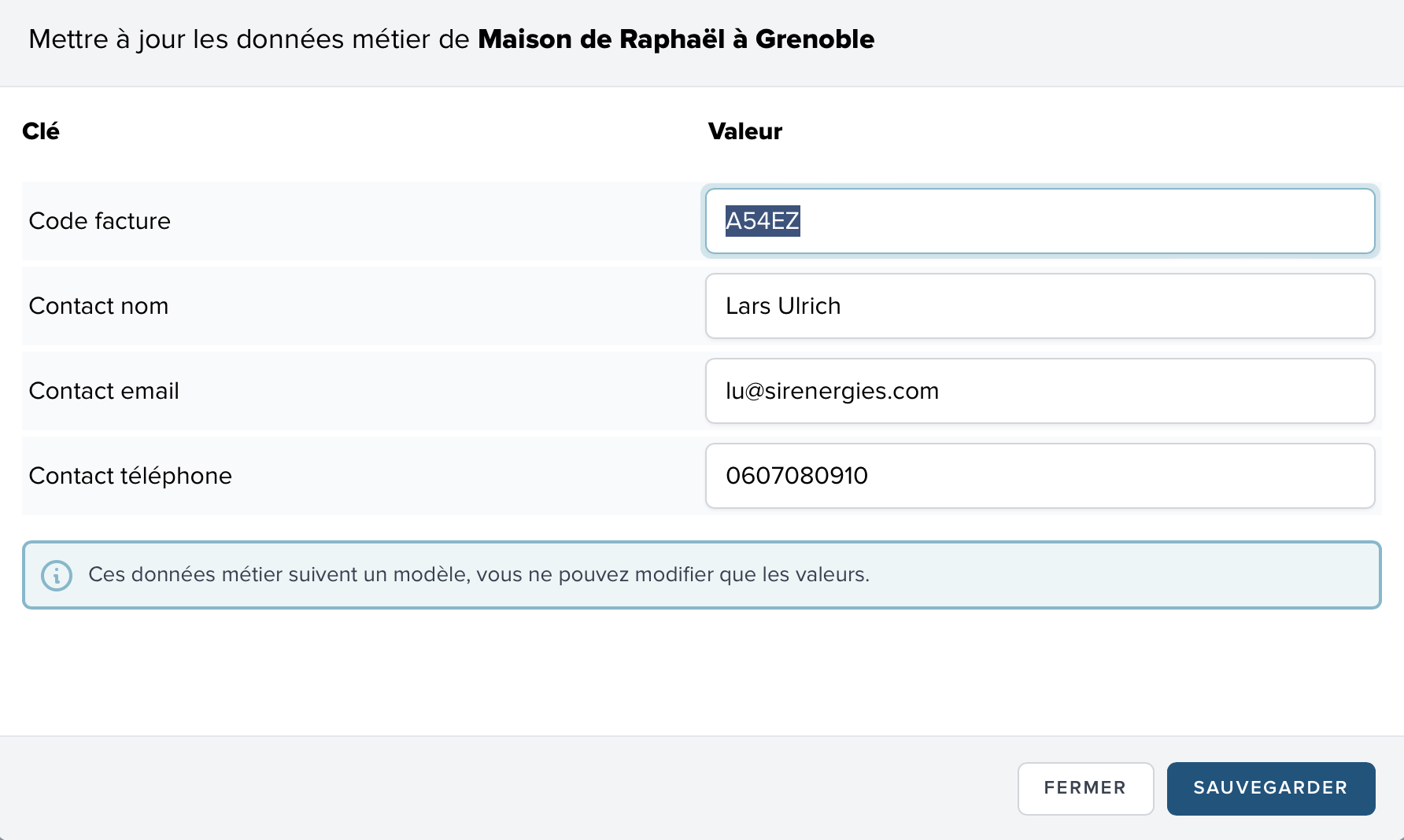 Pour uniformiser un périmètre, vous pouvez définir des modèles de données métier. Les modèles sont propres à chaque entreprise et se définissent depuis la page de préférence de l’entreprise.