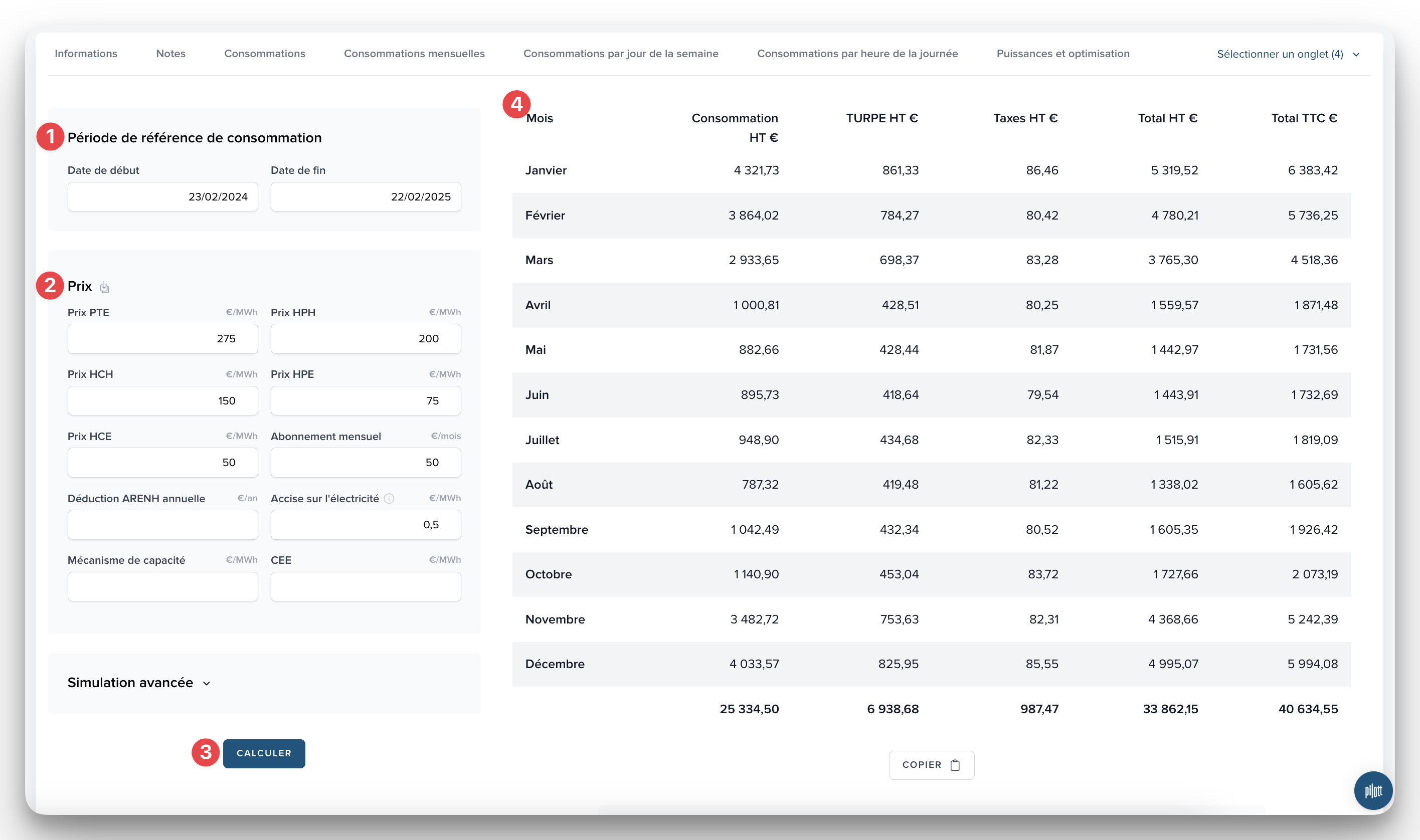 Faites varier les consommations de référence sur lesquelles la simulation se basera, à la hausse ou à la baisse