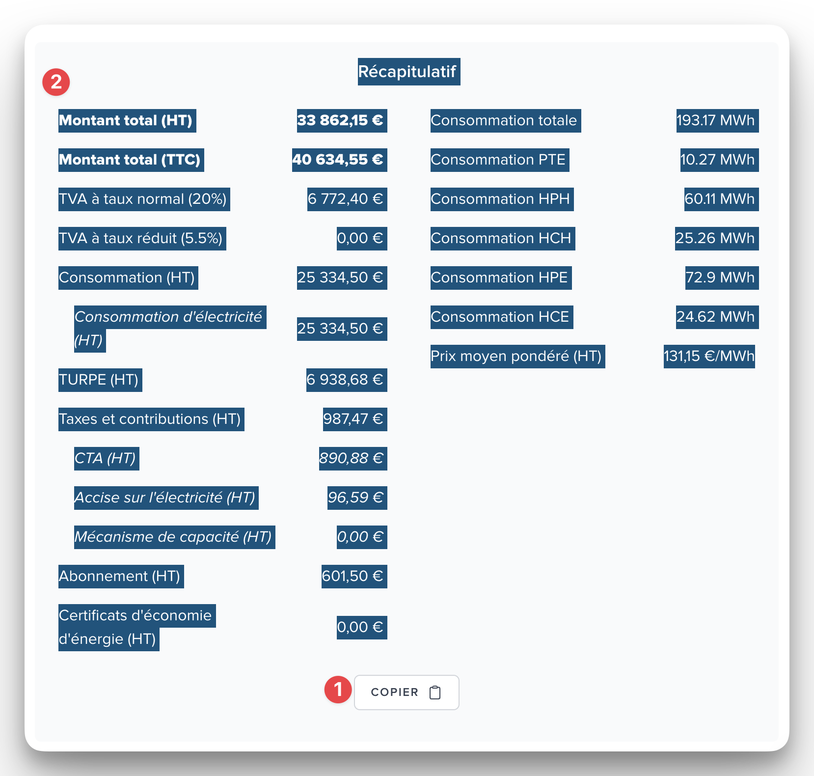 Remplissez les prix pour chaque classe temporelle, l’accise sur l’électricité (ex-TICFE), l’éventuel abonnement mensuel, etc.
