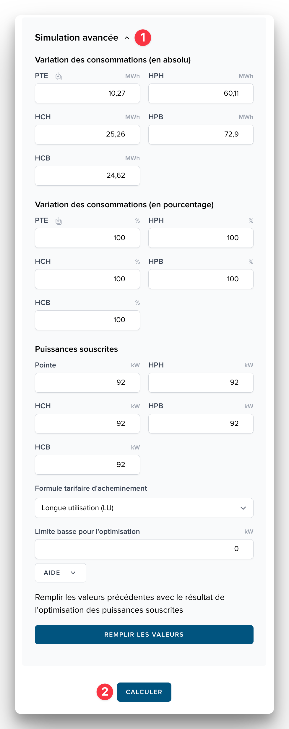 Modifiez éventuellement les puissances souscrites et la formule tarifaire d’acheminement